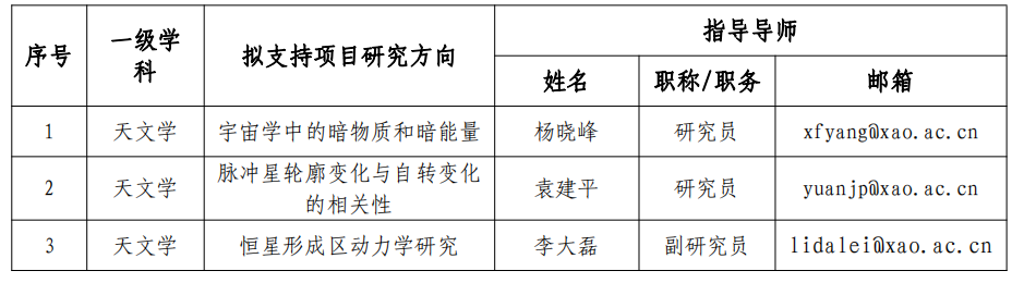 中科院新疆天文台现开展2022年大学生“科创计划”项目申报工作,“科创计划”项目指南详见下表。在校大学生可根据自己的专业兴趣,选择相应项目和指导教师(在申请学生本校可设共同指导教师)。有意向的学生在与项目指导教师充分沟通后,登录中国科学院大学科教结合协同育人行动计划( ),选择“科创计划”进行注册,然后在网上进行项目填报,请注意随时保存信息。全部填报完毕并确认无误后,点击提交,下载并打印申请表,请学籍所在学校(或学院)签字盖章后寄至项目设立导师,导师签字同意后交天文台研究生部。