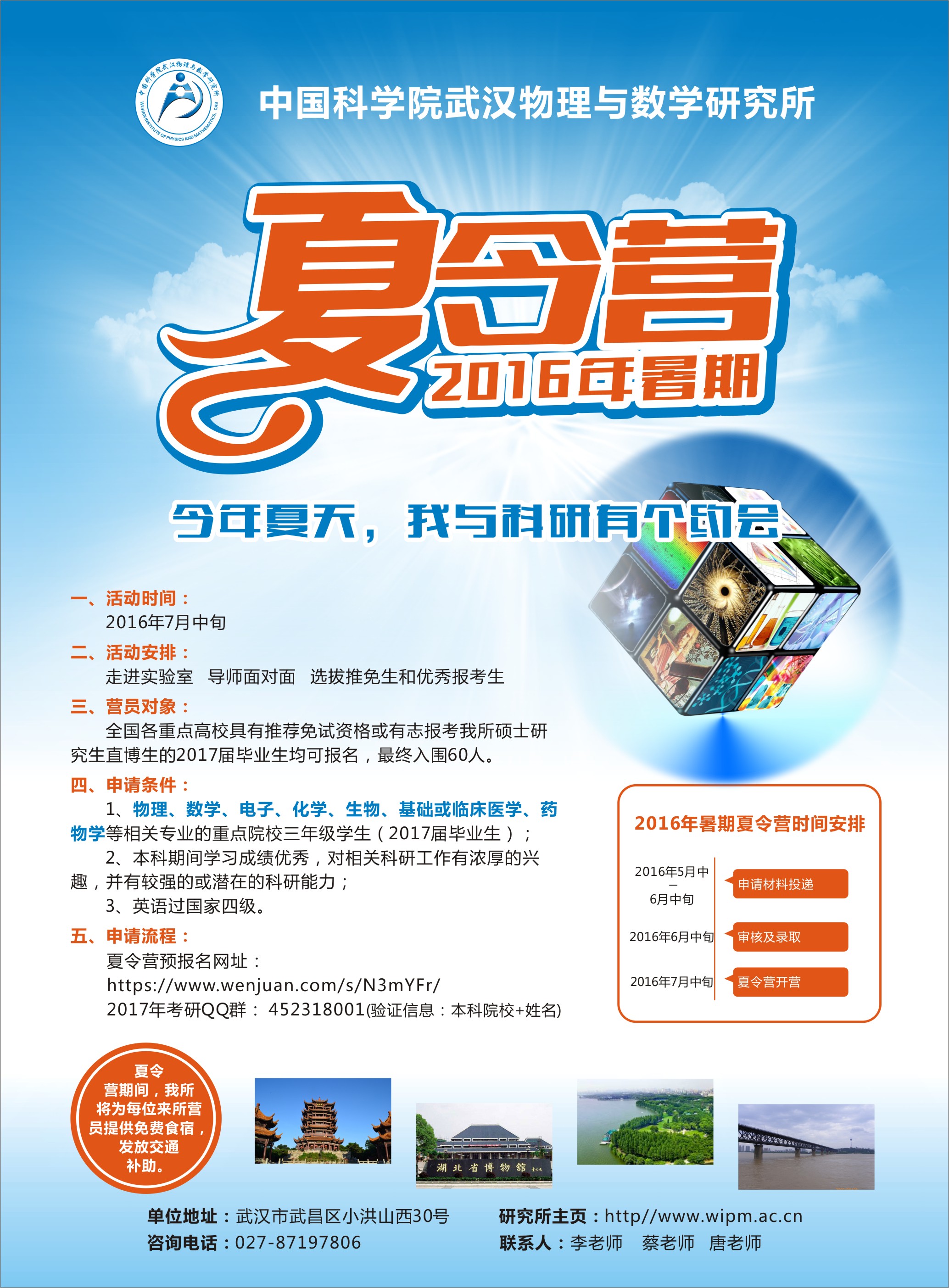 中国科学院武汉物理与数学研究所是中国科学院大学的培养单位之一,坐落在著名的武汉东湖之滨和风景秀丽的珞珈山西麓,已成为以核磁共振波谱学、原子与分子物理和数学物理研究为主,积极开展原子频标等高技术研发,同时致力于高技术成果转移转化的综合型国立研究所。学科背景涵盖物理、电子、生物、化学、医学、数学等领域。研究所2016年大学生夏令营拟于7月中旬举行,目前预报名已开始,欢迎你的加入。