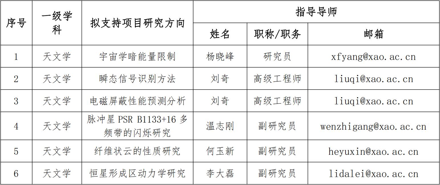 中科院新疆天文台现开展2021年大学生“科创计划”项目申报工作,“科创计划”项目指南详见下表。在校大学生可根据自己的专业兴趣,选择相应项目和指导教师(在申请学生本校可设共同指导教师)。有意向的学生在与项目指导教师充分沟通后,登录中国科学院大学科教结合协同育人行动计划(http://kjxt.ucas.ac.cn/index.php/zh/ ),选择“科创计划”进行注册,然后在网上进行项目填报,请注意随时保存信息。全部填报完毕并确认无误后,点击提交,下载并打印申请表,请学籍所在学校(或学院)签字盖章后寄至项目设立导师,导师签字同意后交天文台研究生部。